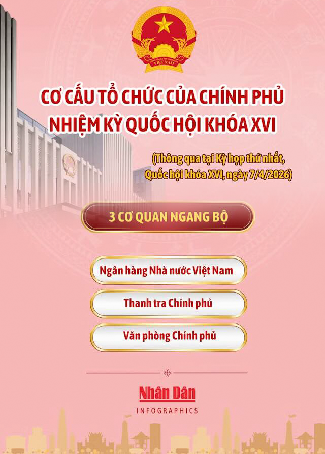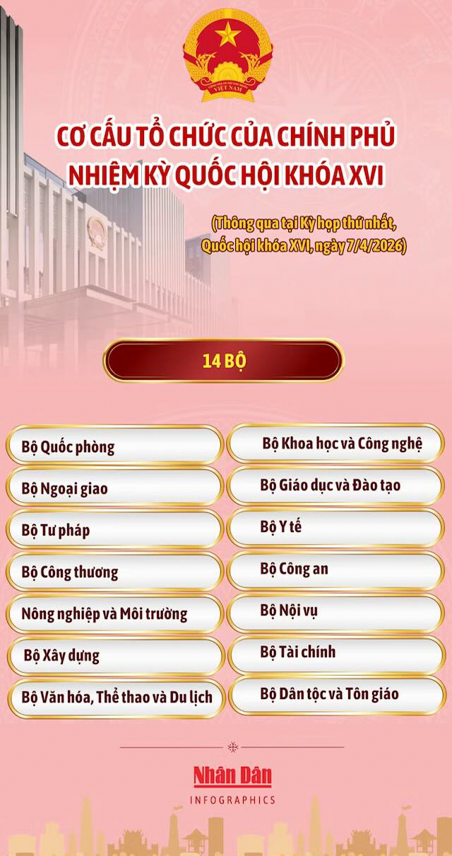 Ngày 7/4/2026, tại Kỳ họp thứ nhất, Quốc hội khóa XVI đã thông qua Nghị quyết về cơ cấu tổ chức của Chính phủ nhiệm kỳ mới. Theo đó, bộ máy Chính phủ được tổ chức gồm 14 bộ và 3 cơ quan ngang bộ, nhằm bảo đảm tinh gọn, hiệu lực, hiệu quả, đáp ứng yêu cầu quản lý nhà nước trong giai đoạn phát triển hiện nay.