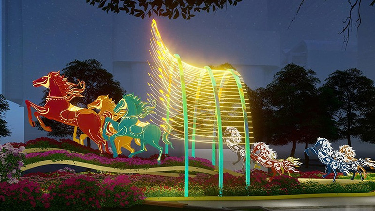 Đường hoa Nguyễn Huệ 2026 hứa hẹn sẽ là một kiệt tác sắp đặt hoa quy mô nhất từ trước đến nay với hơn 100.000 giỏ hoa đa chủng loại. Đại cảnh "Ngựa chín hồng mao" lấy cảm hứng từ truyền thuyết Sơn Tinh - Thủy Tinh. Linh vật này được khắc họa với các lớp màu, đạt chiều cao 6,4 m, với "Chín hồng mao" mang ý nghĩa viên mãn, cát tường, trọn vẹn, kết hợp các gam màu nóng - lạnh và hiệu ứng sơn chuyển màu tạo nên một "biển màu sắc" thay đổi liên tục theo góc nhìn của du khách.