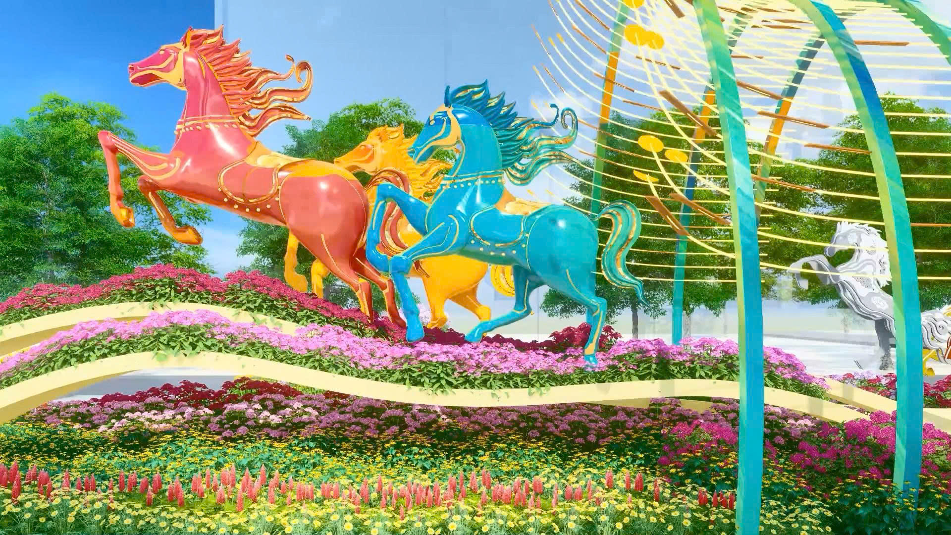Cụm 9 con ngựa có chiều cao gần 6 m, được đặt trên bục mô phỏng đường đua, tạo cảm giác chuyển động mạnh mẽ. So với những linh vật ở các năm trước, tạo hình ngựa có những đặc điểm chung, thuận lợi hơn trong khâu tạo hình, song lại đòi hỏi sự tinh tế ở bề mặt để bảo đảm khả năng bắt sáng và phản quang tối ưu.