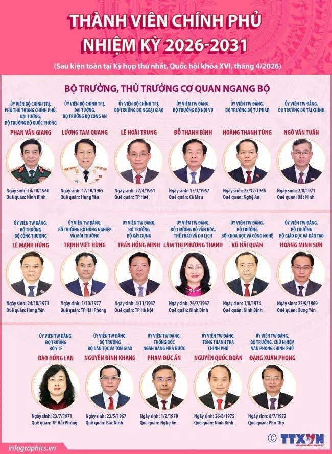 Thành viên Chính phủ nhiệm kỳ 2026–2031 theo Nghị quyết Quốc hội khóa XVI