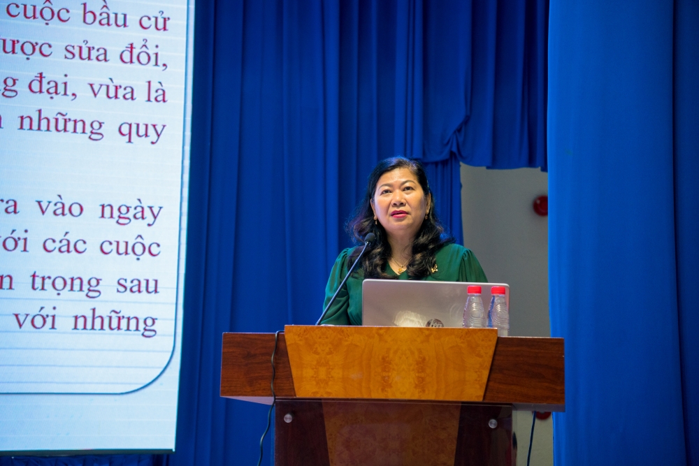 Tại hội nghị, bà Nguyễn Thị Hồng Thắm – Nguyên Phó Giám đốc Sở Nội vụ Thành phố Hồ Chí Minh đã trực tiếp báo cáo, hướng dẫn các nội dung trọng tâm về nghiệp vụ công tác bầu cử.
